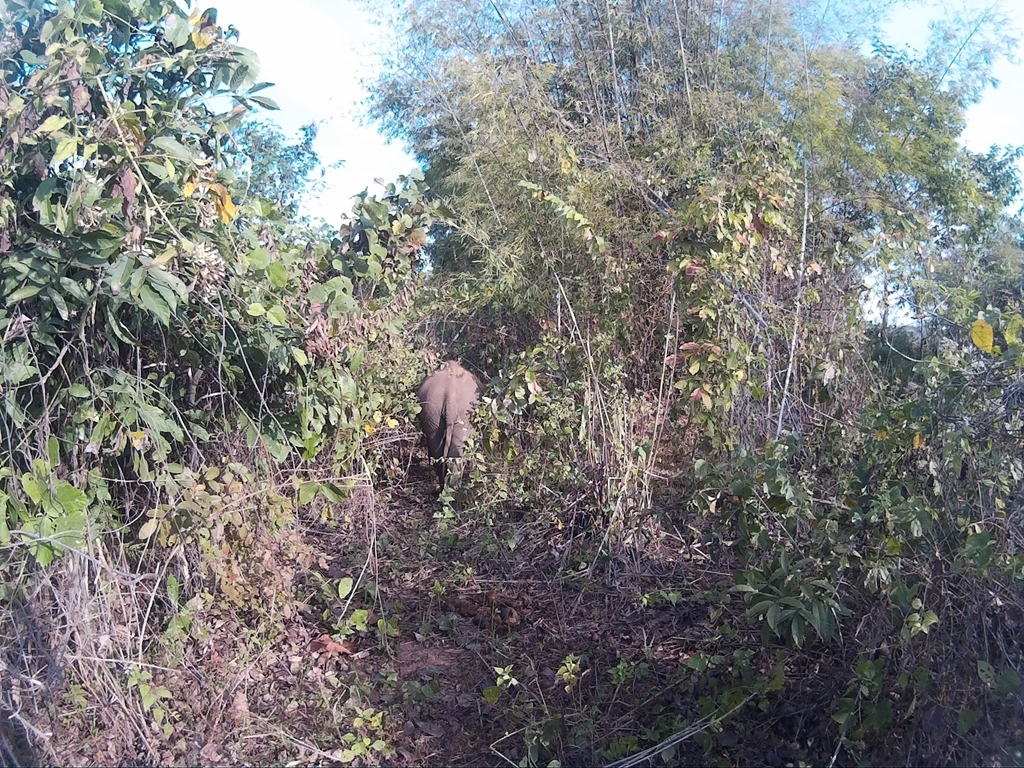 In der Wildnis, erklärt uns unser Guide, legen Elefanten jeden Tag ganz schöne Strecken zurück. Deswegen ist es für sie auch nicht gut, wenn sie nur im Gehege rumstehen, sondern sie müssen sich bewegen. Wir machen also “Cardio” für den Elefanten durch ein bisschen Dickicht und einen Berg hoch.