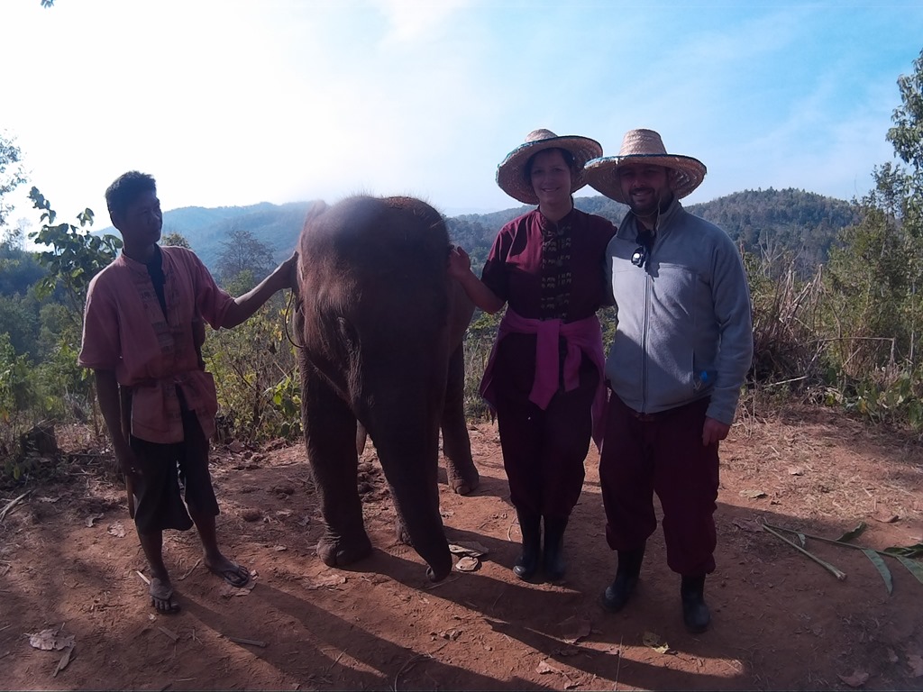 Als wir angekommen sind, stellen wir fest, dass wir heute die einzigen beiden Touristen dort sind und dass momentan auch nur zwei Elefanten im Park sind. Einer davon hat aber eine Fußverletzung und bleibt somit am eigentlichen Park-Zentrum, während wir dem anderen auch durch das Gelände folgen dürfen. Bevor es jedoch soweit ist, schmeißen wir uns in schicke Klamotten, die der Park uns zur Verfügung stellt. Dann geht es aber schon zu den Elefanten!