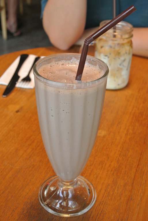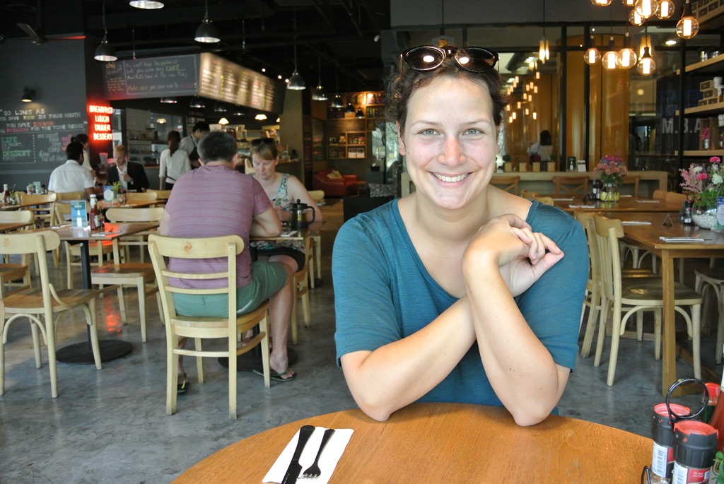 Unsere Wahl fällt auf Eggs Benedict und Pfannkuchen mit Banane, Walnüssen und Ahornsirup sowie zwei Milchshakes. Was dekadent klingt, sieht auch dekadent aus und schmeckt wahnsinnig gut. Wir sind begeistert! Liebe geht bei uns ja durch den Magen und das war eines der besten Frühstücke die wir je hatten. Vielleicht ist Bangkok ja garnicht so schlimm. Winking smile