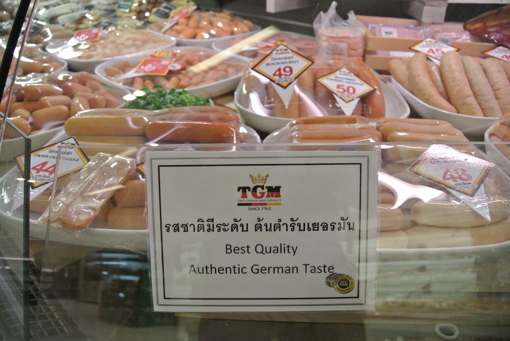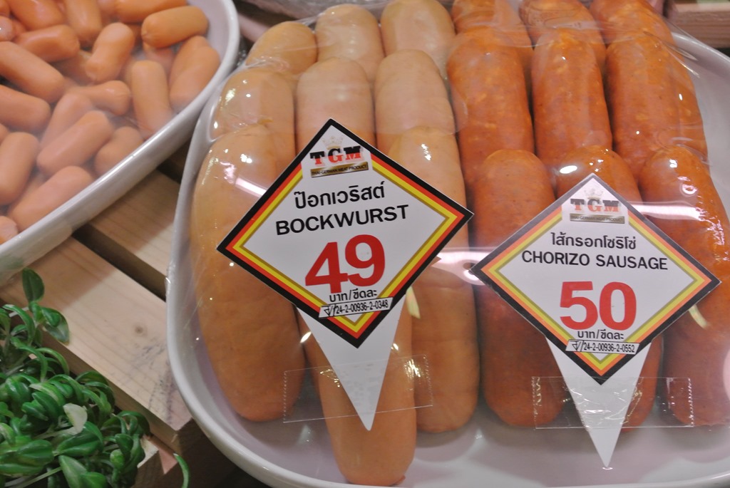 Im Keller finden wir noch einen sehr gut sortierten Supermarkt, der sogar deutsche Bockwurst führt. Das haben wir ja in Thailand bisher noch nicht gesehen! Wir haben uns aber keine gekauft, in wenigen Stunden sind wir ja schon zuhause und können uns die Originale genehmigen. Auch viel Obst gibt es. Conny liebt es, durch Supermärkte in fremden Ländern zu flanieren, da das Produktsortiment trotz Globalisierung immer deutlich anders ist als zuhause und manchmal doch einige interessante Produkte dabei sind.