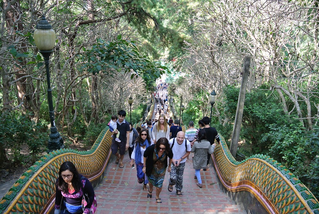 Das kostet zwar ein wenig Puste, ist aber ein schöner Weg bergan. Alleine die Seitenbegrenzungen der Treppe sind schon sehenswert, diese sind nämlich mehrköpfige Schlangen oder Dämonen.