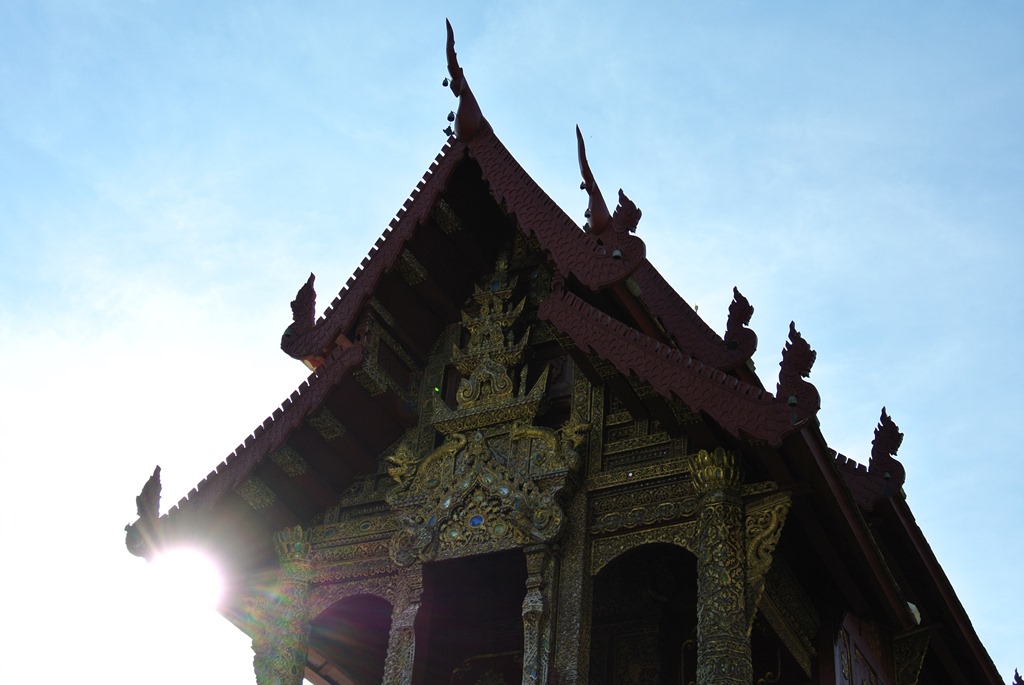Zwei Straßen weiter ist der Tempel Wat Phan Tao. Er sieht von der Straße her eher unscheinbar aus, da er nicht so golden glänzt wie andere Tempel und aus dunklem Holz gebaut ist. Hinter dem Tempel befindet sich jedoch der absolute Augenöffner.