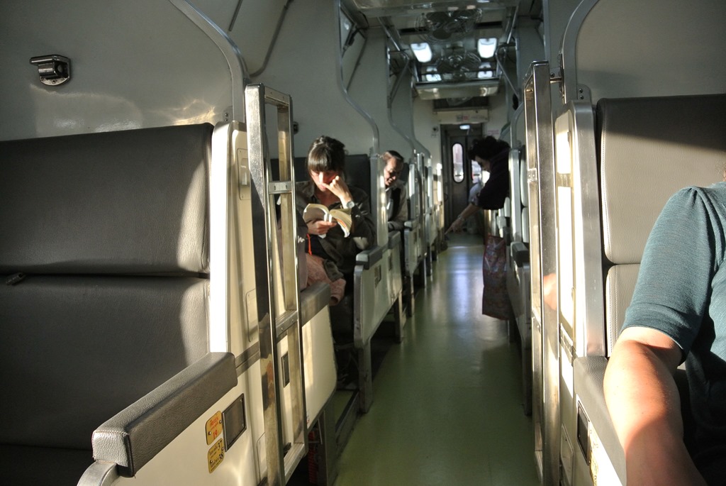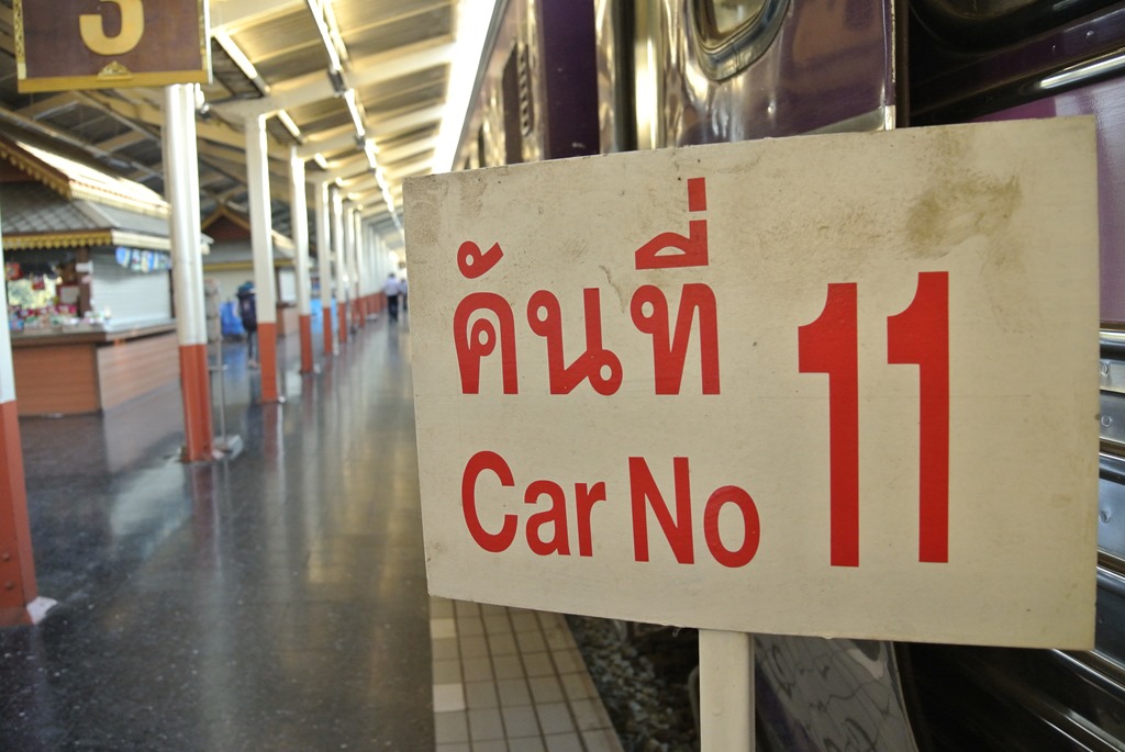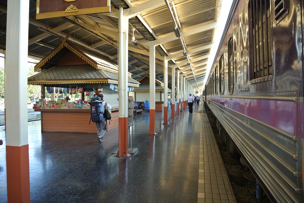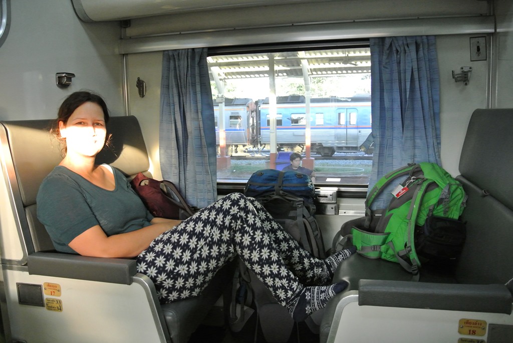 Der kommt dann auch erstaunlich pünktlich und sah genau so aus wie wir das erwartet haben. Für alle Bahnreisenden kann ich übrigens nur die Webseite The Man in Seat Sixty-One empfehlen. Dort gibt es für fast jedes Land der Erde Infos, wie der Bahnverkehr vor Ort organisiert ist und welche Züge im Einsatz sind. So hatten wir uns auf Basis der dort verfügbaren Informationen dafür entschieden, nicht 1. Klasse zu fahren, obwohl wir uns das durchaus hätten leisten können bei thailändischen Preisen.