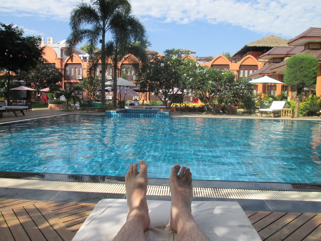 Der Weg zurück zum Hotel führte dann wieder am Wassergraben des Königspalastes vorbei, die Fotos ersparen wir euch aber. Der Graben sieht nämlich noch genauso aus wie am Vortag. Überraschung. Zurück im Hotel, wollten wir dann mal den burmesischen BBQ-Laden direkt bei uns um die Ecke ausprobieren, der hat zwar nix in englisch, soll aber gut sein.