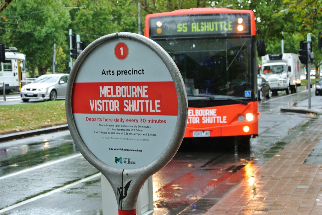 Heute morgen sind wir wieder etwas früher unterwegs, denn wir wollen heute das Visitor Shuttle nutzen. Das ist ein klassischer Hop-On-Hop-Off-Bus, kostet aber nur 5$ pro Person und ist offiziell von der Stadt Melbourne. Es gibt hier auch einen Citysightseeing-Bus mit ähnlicher Route, der kostet aber irgendwie 45$. Ich frage mich, wer das macht. Naja. Wir auf jeden Fall direkt mal morgens rein in den Bus. Drinnen ist es wenigstens trocken. Denn nachdem wir jetzt zwei Tage strahlenden Sonnenschein hatten, schüttet es heute aus Kübeln.