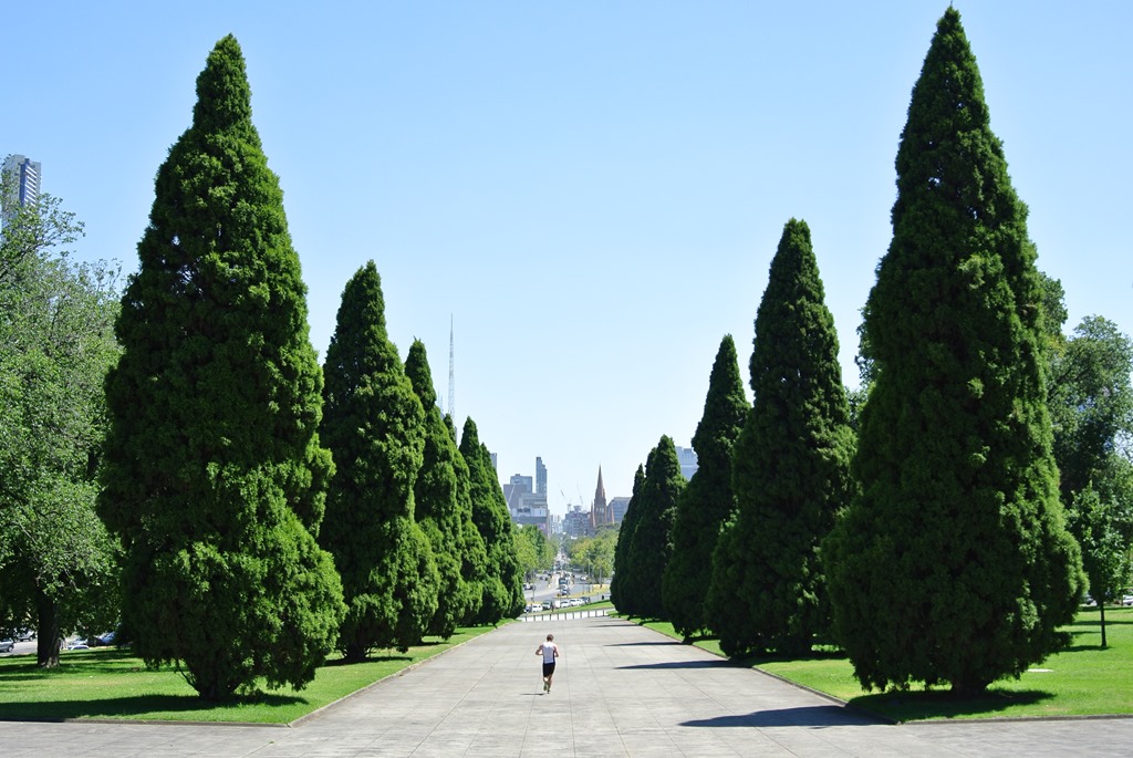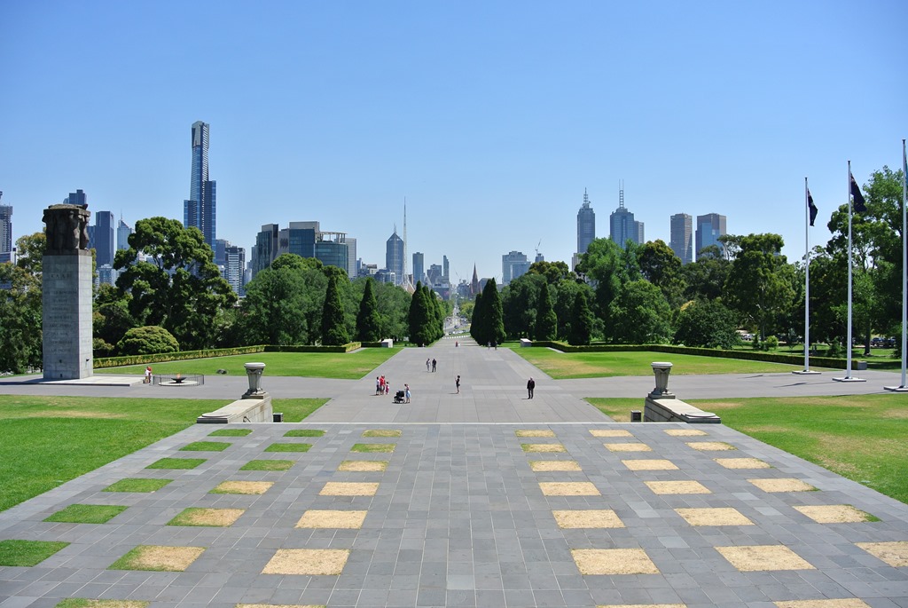 Nachdem das Licht erloschen war, haben auch alle Australier im Raum im Chor einige Gedenkworte gesprochen, da war es uns schon fast unangenehm, dass wir nicht wussten, dass man das hier macht. Kurz noch ein wenig umgeschaut und dann raus und weiter in Richtung Innenstadt. Die Skyline von Melbourne sieht man von hier schon sehr gut und das ist auch die richtige Richtung für uns.