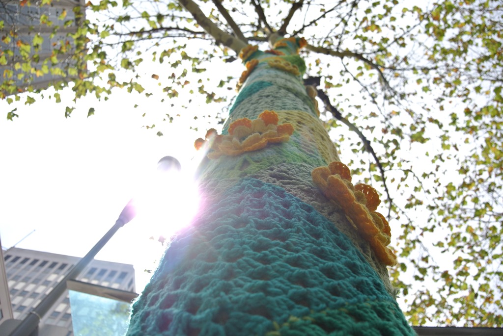 Inzwischen ist es mitten am Nachmittag und wir haben noch einiges im Hostel zu tun, so dass wir uns auf den Rückweg machen. Auf dem Weg zur Tram entdecken wir noch massig eingestrickte Bäume. In Darmstadt hat man das ja manchmal in Ansätzen gesehen, hier sind es echt unglaublich viele und unglaublich kreativ eingestrickte Bäume.