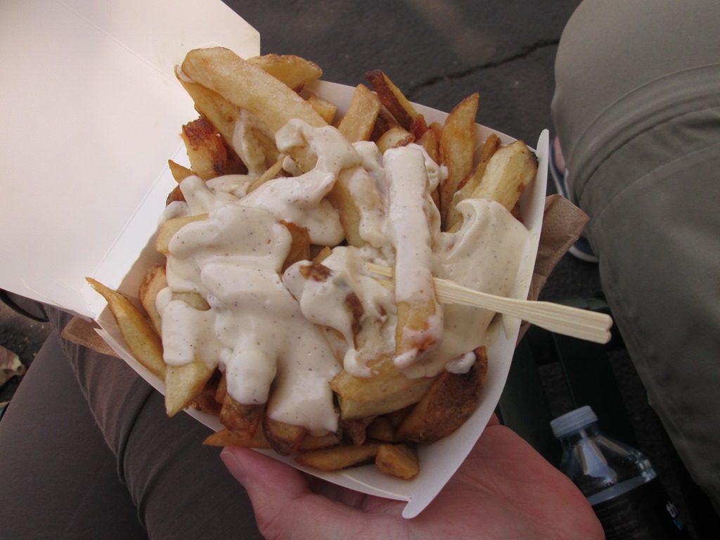 Hier beobachten wir viele Büroangestellte in ihrer Mittagspause. Auch unglaublich viele Jogger kommen hier vorbei, das haben wir noch in keiner Stadt so krass erlebt. Es sind nicht nur unglaublich viele, sondern sie sind auch alle verdammt schnell und verdammt muskulös. Da macht das Pommes-essen gleich doppelt so viel Spaß. Waren aber echt grandios, aber das nur nebenbei.