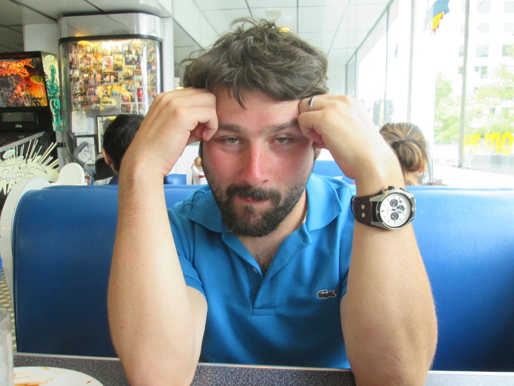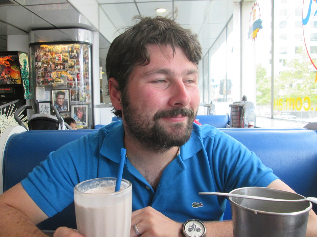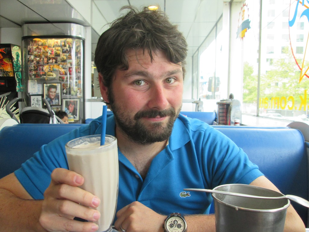 Abends waren wir dann auch mal gescheit essen, nicht immer Toast. Und zwar waren wir bei Soda Rock Diner. Das ist hier ein 50er-Jahre American Diner direkt um die Ecke und wir hatten schon seit 2 Tagen beschlossen, hier mal richtig cool essen zu gehen. Das haben wir dann heute gemacht. Schön Fritten, Getränk und Burger für jeden. Dazu grandiose 50er Jahre Musik. Auch der Shake war super, wie man mir in folgender Bilderserie ansieht: